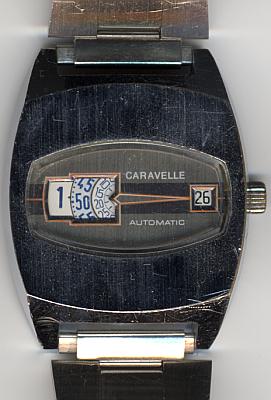 Das “Zifferblatt” bot einen klaren Überblick über die Zeit mit springenden Stunden, sowie gleitenden Minuten und Sekunden. Und als Bonus gab es noch ein, per Druck auf die Krone schnellverstellbares, Digitaldatum dazu. Bei einfachen Digitaluhren wechselte die Stunde gleitend zwischen :55 und :00, bei besseren Uhren wie dieser Caravelle sprang es in einem Satz um - ungefähr (es war ja keine Rolex Datejust) - zur vollen Stunde.