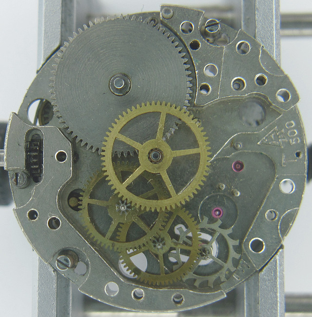 Zifferblattseitig erkennt man gut den Wippenaufzug und das Gesperr mit Sperrklinke und -Feder.