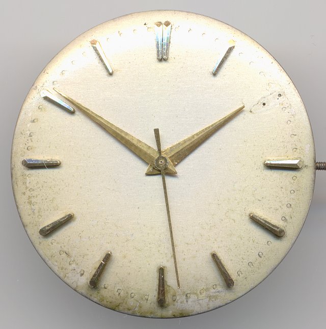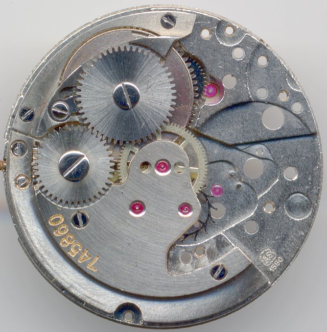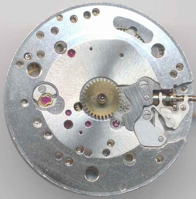 Zifferblattseitig fällt als erstes die Incabloc-Stoßsicherung mit ihrem eigenen Lagerplättchen auf. Dadurch war es möglich, daß dieses Werk bei Bedarf auch mit anderen Stoßsicherungstypen, oder auch ganz ohne Stoßsicherung erhältlich war.
