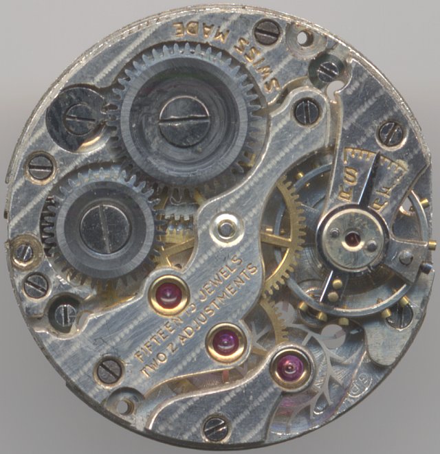 Das Werk ist noch ohne Stoßsicherung ausgestattet, besitzt dafür einen langen Rückerzeiger, der auf einer ungewöhnlich feinen Skala endet. Die Lagersteine sind im sichtbaren Bereich in gepreßten Chatons eingefaßt und die Ankerradbrücke erleichtert die Servicearbeiten ungemein.