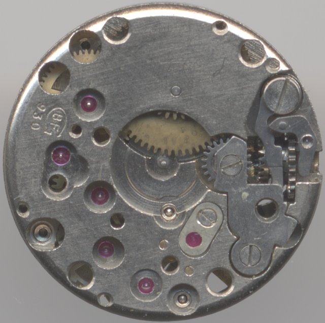 Wie üblich bei Baumgartner gibt es auch bei diesem Werk kein Minutenrad, sondern Stunden- und Minutenzeiger werden rein zifferblattseitig indirekt über eine Rutschkupplung auf dem Federhaus getrieben.