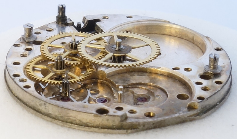 Der klassische Räderwerksaufbau besticht ebenfalls durch seine sehr hochwertig ausgeführten Räder. Wie damals üblich treibt das Federhaus das zentrale Minutenrad direkt an, gefolgt von Kleinbodenrad, Sekundenrad (das eine kleine Sekunde auf 6 Uhr ermöglichen würde) und dem polierten Ankerrad.
