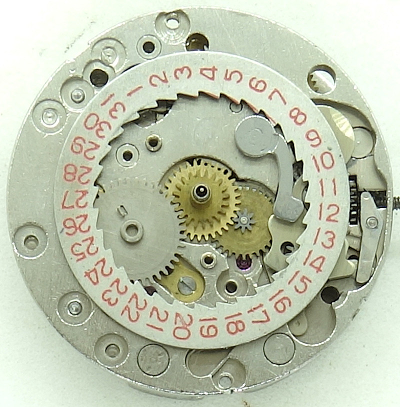 Auf der Zifferblattseite erkennt man den Wippenaufzug mit einem recht ordentlich ausgeführten Gesperr (bei 11 Uhr).