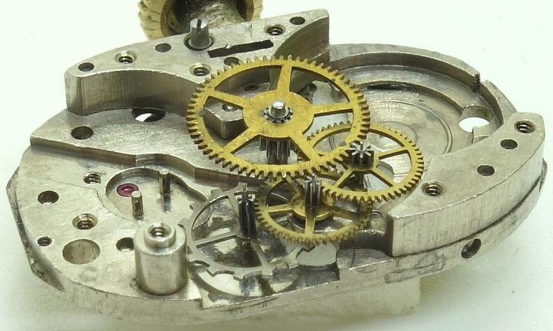 Der Aufbau des Räderwerks ist typisch für ein Formwerk dieser Größe: Das Federhaus, welches einen recht hohen Durchmesser besitzt, treibt das zentrale Minutenrad an, gefolgt von Kleinbodenrad, Sekundenrad und Ankerrad.