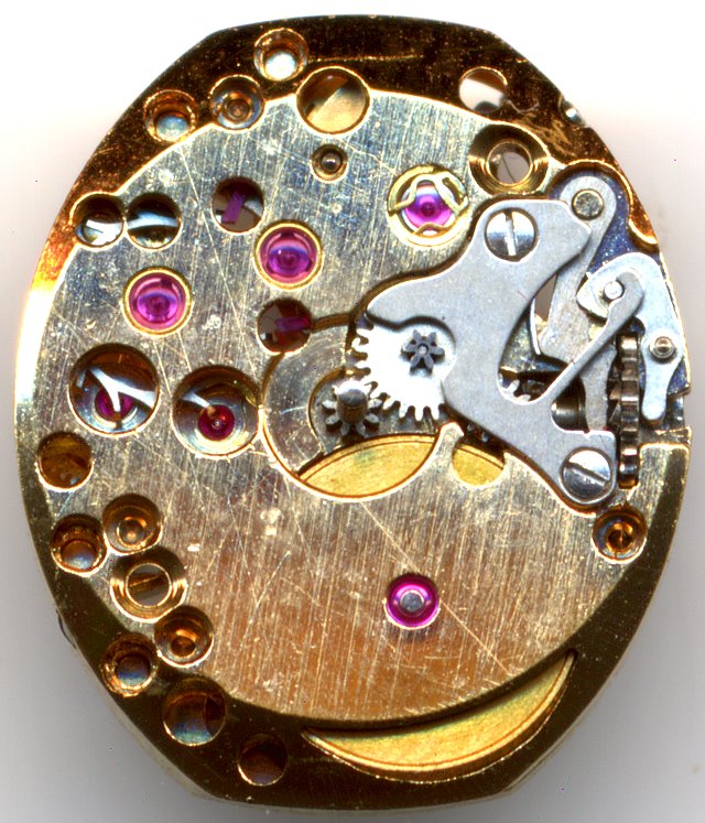 Das Bulova 5 BD ist ein außergewöhnlich gut verarbeitetes Damenuhren-Formwerk, welches grob um 1970 debütierte. Es beeindruckt nicht nur durch seine hochglanzpolierte goldfarbige Ausführung, sondern vor allem durch die Zahl der verbauten Steine: 23 Stück sind in dieser Klasse rekordverdächtig!