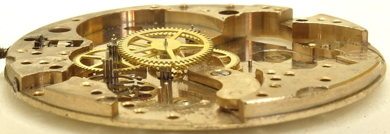 Das Automaticgetriebe ist ungewöhnlich komplex: Der (hier noch nicht montierte) Microrotor sitzt auf dem innersten Rad und gelangt über ein Wechselrad zum Eingriff mit einem Gleitritzel. Dieses fliegend gelagerte Gleitritzel hat die Aufgabe, je nach Drehrichtung des Rotors und des Gleitritzels, entweder das innere oder das äußere Wechselrad anzutreiben. Beide Wechselräder stehen in Verbindung, so dass am Ende immer dafür gesorgt wird, dass sich das äußere Wechselrad stets in derselben Richtung dreht.
