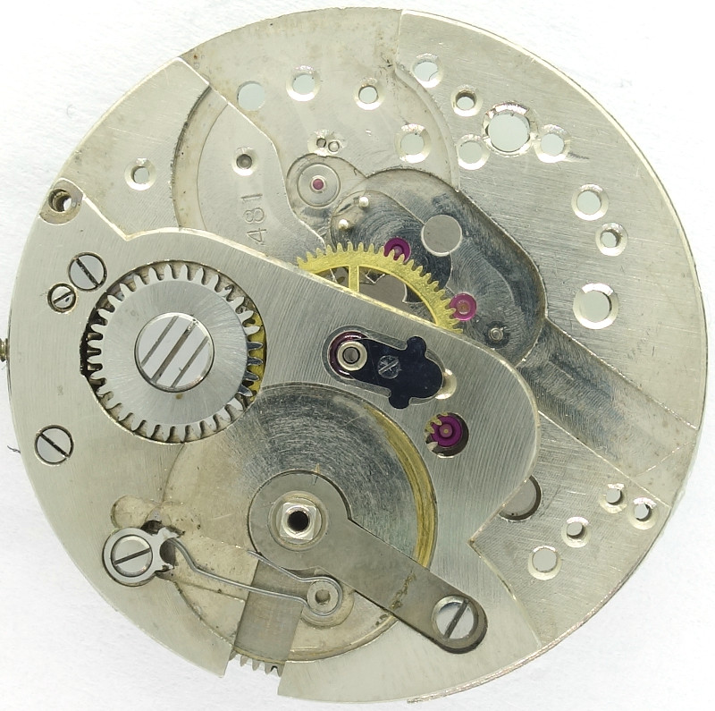 Die Grundplatine läßt schon die hohe Qualität des Werks erahnen, sogar das Minutenrad läuft in einem Steinlager, und man sieht schon die Aussparungen links unten, durch die das Federhaus seitlich entnommen werden kann.