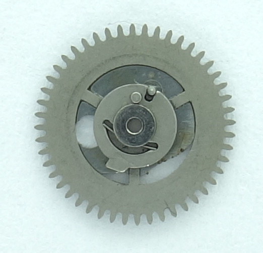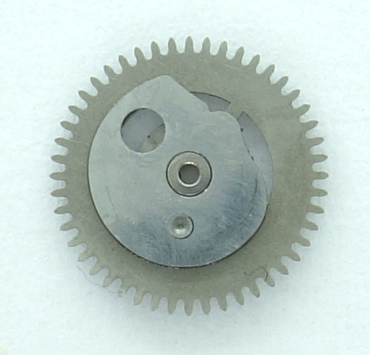 Der bewegliche Nocken auf der Unterseite spannt das Schaltrad den ganzen Tag über vor, so dass es sich um Mitternacht schlagartig entladen und beide Kalenderanzeigen, Tag und Wochentag, um eine Stelle weiterschalten kann. Zumindest in der Theorie, in der Praxis kann es sein, dass der Sprung zwar um Mitternacht beginnt, aber erst um 1 Uhr beendet wird. Offenbar spielt hier Reibung doch eine größere Rolle.