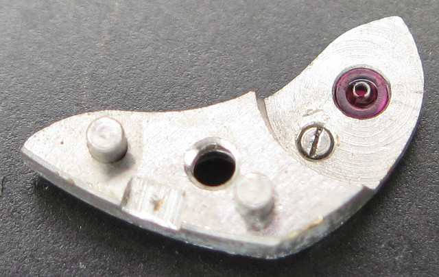 Auf der Zifferblattseite erkennt man neben der speziell geformten Winkelhebelfeder noch die Fragmente einer Minuterie, mit der seinerzeit Werke vor dem Einschalen reguliert wurden.