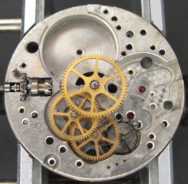 Minuten-, Kleinboden- und Sekundenrad sind unter einer eigenen Brücke gelagert, das Ankerrad läuft unter einem eigenen Kloben. Dieser ist besonders schön ausgeführt mit einem Deckstein, dessen hochglanzpolierte Einfassung ungewöhnlich groß ist und dadurch noch sehr an hochwertige Taschenuhrwerke erinnert.