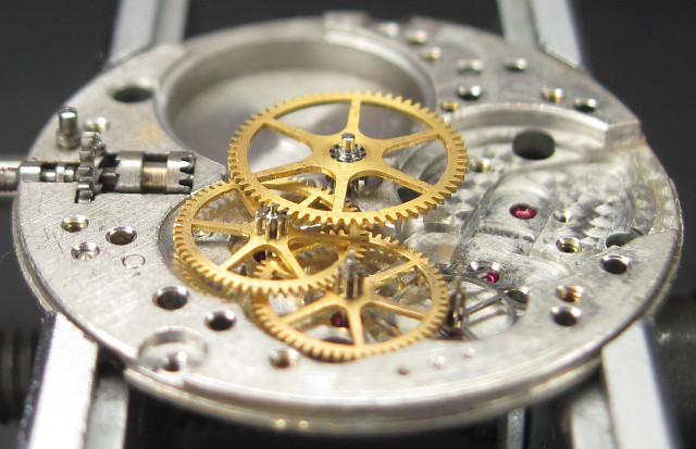 Das Räderwerk ist noch klassisch aufgebaut, mit dezentraler Sekunde auf “6”, Kleinbodenrad und direkt vom Federhaus angetrieben Minutenrad.