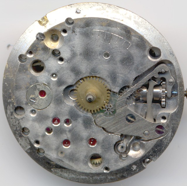 Das hier vorgestellte Werk kam in einem Gehäuse mit fehlendem Glas, dessen Boden nicht mehr hielt. Es war zusammen mit dem Zifferblatt eingeklebt(!), der Kleber ḱonnte nur mit Mühe vom Werk entfernt werden, leider nicht restlos. So bleibt der Rücker weiterhin verklebt und auch die Unruhspirale ist durch Kleberreste beschädigt.