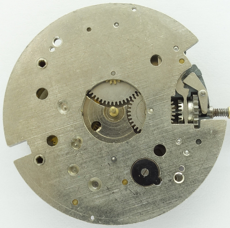 Das dezentrale Sekundenrad, das einen etwas kleineren Durchmesser als das zweite Zwischenrad besitzt, wird jeweils über den Außenzahnkranz angetrieben.