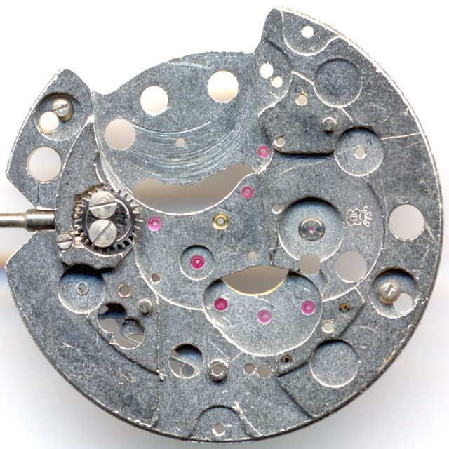 Auf diesem Foto, bei dem der Rotor fehlt, ist sehr schön zu erkennen, daß das eigentliche Werk nur einen Teil der Grundplatine nutzt. Das ist darin bedingt, daß es dieses Werk auch in einer kleineren Ausführung mit 8 3/4 Linien gibt. Für EB ein sehr kostensparender Weg, andererseits bleibt hier viel Platz ungenutzt, der, wenn sonst zur Verbesserung der Gangwerte hätte genutzt werden können.