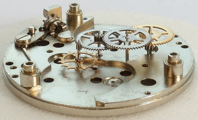 Der Kupplungsaufzug befindet sich bei diesem Werk übrigens auf der Werksplatine nicht nicht auf der Zifferblattseite - ebenfalls typisch für EB.