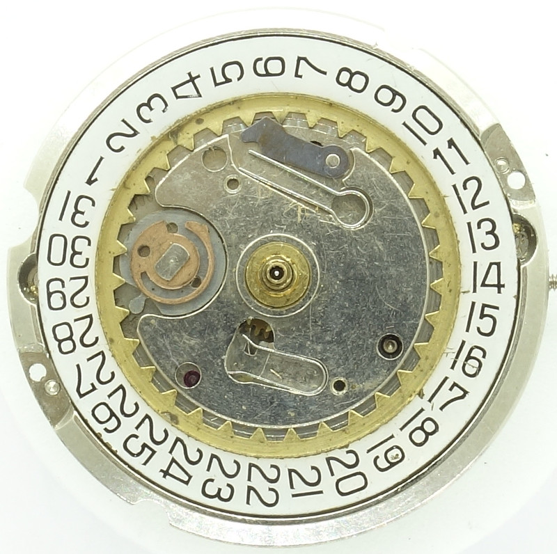Der Datumsring wird mit einer Feder-Klinken-Kombination in genauer Position gehalten, die Funktion der zweiten Feder (bei 6 Uhr) ist nicht bekannt, da sie nicht auf das Sternrad der Wochentagsanzeige einwirkt, welche aber ohnehin von Haus aus stets richtig positioniert ist.