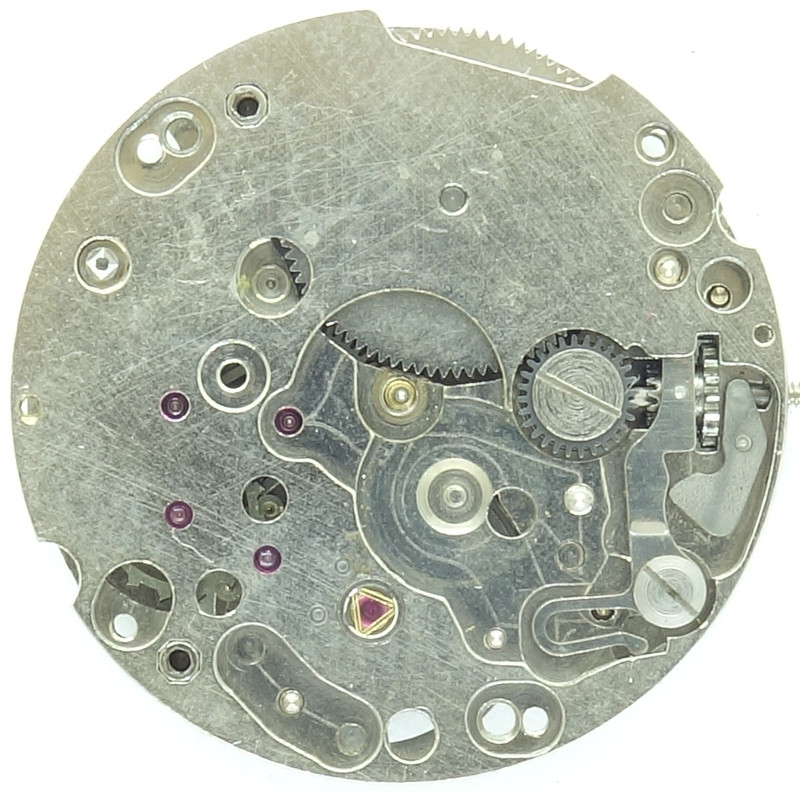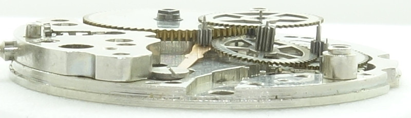 Auf der noch leeren Zifferblattseite läßt sich schön der Kupplungsaufzug erkennen, der ebenfalls eine sehr rationelle Konstruktion ist, besteht er doch lediglich aus einem einzigen Bauteil, dem Winkelhebel, der gleichzeitig seine Winkelhebelfeder ist.