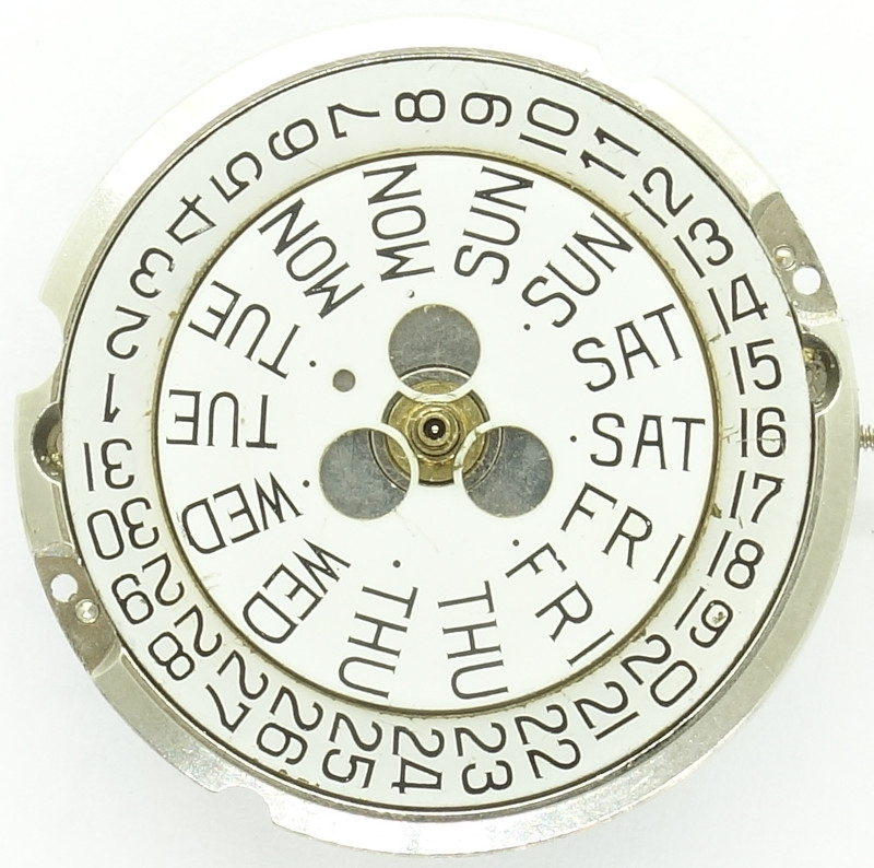 Die Wochentagsscheibe besitzt zwar nur sieben Positionen, ist aber mit jeweils gedoppelten Wochentagen bedruckt, vermutlich, um während der etwas länger dauernden Schaltphase so oft wie möglich den korrekten Wochentag anzuzeigen.