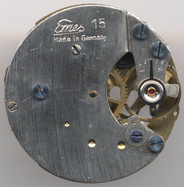 Das Emes Kaliber 15 ist ein ganz typisches 10 1/2 liniges Nachkriegs-Stiftankerwerk aus Deutschland. Konstruktiv ist es praktisch identisch mit den entsprechenden Kalibern von Lord/AHS oder Eppler.