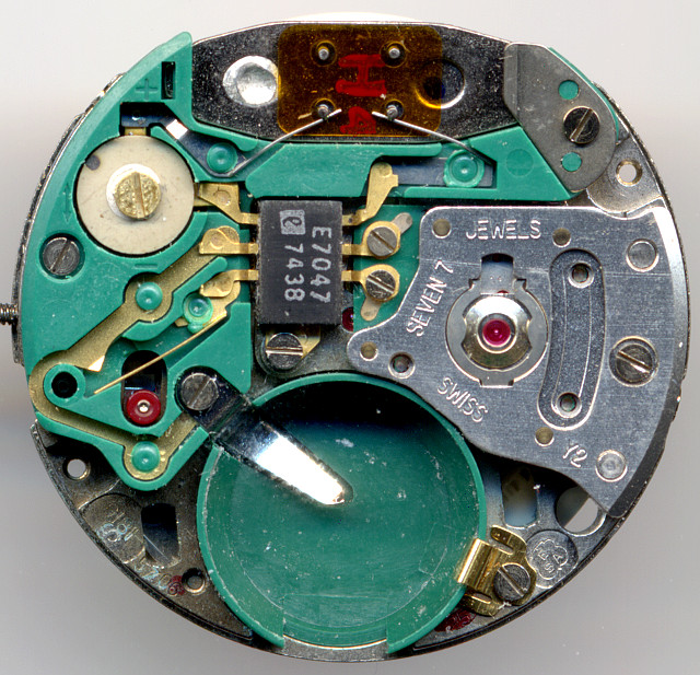 Die Elektronik besteht aus einem integrierten Schaltkreis vom Typ E7047, einem noch recht voluminösen 32768-Hz-Quarz, einem Trimmkondensator und dem daran angeschlossenen Schrittmotor. Die Elektronik ist komplett in eine Plastik"platine" eingebettet, die Anschlüsse in der Regel geschraubt. Alles sieht nach einem sehr hohen Grad an maschineller Verarbeitung aus, im Falle eines Defekts kann dadurch aber nur ganz oder gar nicht repariert werden, was, je älter das Werk, umso schwieriger wird. Vor allem der Schaltkreis und der sehr grosse Quarz wird schon lange nicht mehr produziert.