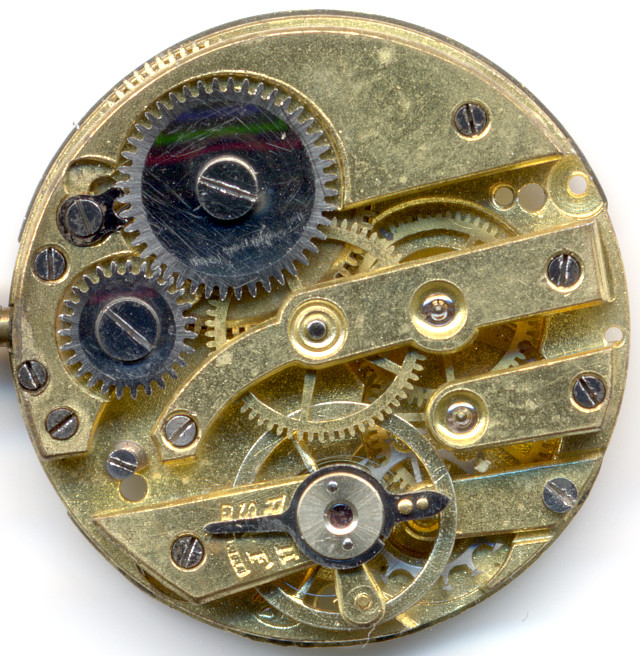 Der Aufbau des Werks erinnert noch sehr stark and die damals üblichen, preiswerten Taschenuhrenwerke mit Zylinderhemmung, und dennoch gibt es eine nicht wirklich zu erklärende Besonderheit: Das Kronrad hat keinerlei Funktion, da der Aufzug von der Zifferblattseite her erfolgt und das Gesperr wie üblich auf das Sperrad einwirkt!