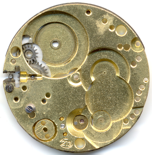 Schätzungsweise aus den 1920er Jahren, als Armbanduhren anfingen, populär zu werden, dürfte das ETA 213, ein für damalige Verhältnisse eher kleines, 10 1/2 liniges Handaufzugswerk mit Zylinderhemmung stammen.