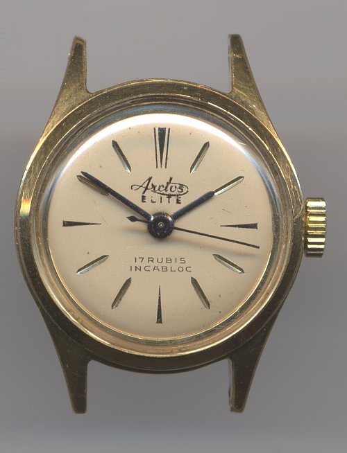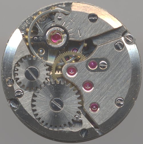 Dieses ist die Basisversion des kleinen 7 3/4 linigen Damenuhrenwerks, das Anfang der 50er Jahre produziert wurde. Im Gegensatz zu seinem direkten Verwandten, dem ETA 2363 meiner Sammlung ist hier das Spiralende noch fest mit dem Unruhkloben verbunden.