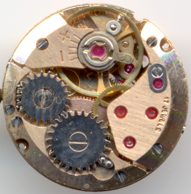 Zifferblattseitig sieht man den von ETA gewohnten Aufbau mit dem Kupplungsaufzug, der Justage-Minuterie, den Vorbereitungen für die Aufnahme weiterer Decksteine (in der 17-steinigen Version) und dem nicht steingelagerten Trieb des Kleinbodenrads (bei “8”), der das Minutenrad antreibt.