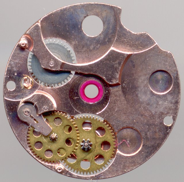 Die vergleichsweise große Verzahnung des Rotors treibt ein vierstufiges Reduktionsgetriebe mit Klinkenwechlser an - eine Konstruktion, die bis heute noch in Werken wie dem ETA 2824-2 verwendet wird.