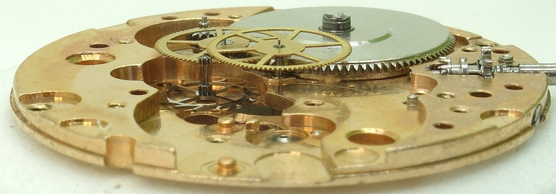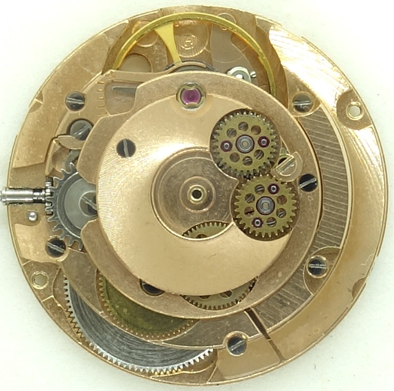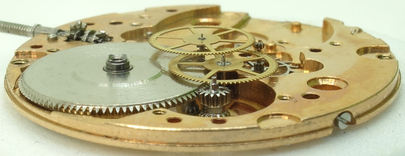 Den damals sehr modernen Räderwerksaufbau verwendet ETA bis heute in seinen Werken: Federhaus, Großbodenrad, Kleinbodenrad, direkt angetriebenes Zentralsekundenrad und schließlich das Ankerrad.