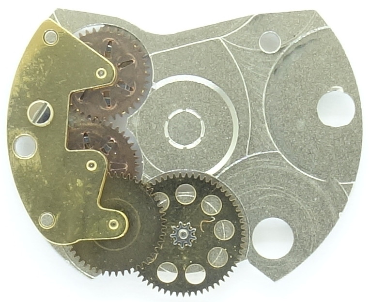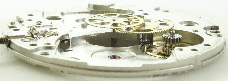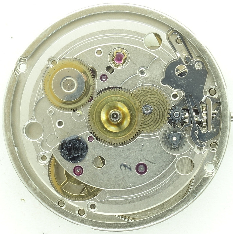 Die Grundplatine zeigt nicht nur, dass alle wichtigen Lager (mit Ausnahme der Zentralsekunde) mit Steinen ausgestattet sind, man sieht auch, dass es sich hier um ein Werk mit indirekt geführtem Zeigerwerk handelt - eine moderne Konstruktion, die unter anderem von ETA Anfang der 1950er Jahre eingeführt wurde.
