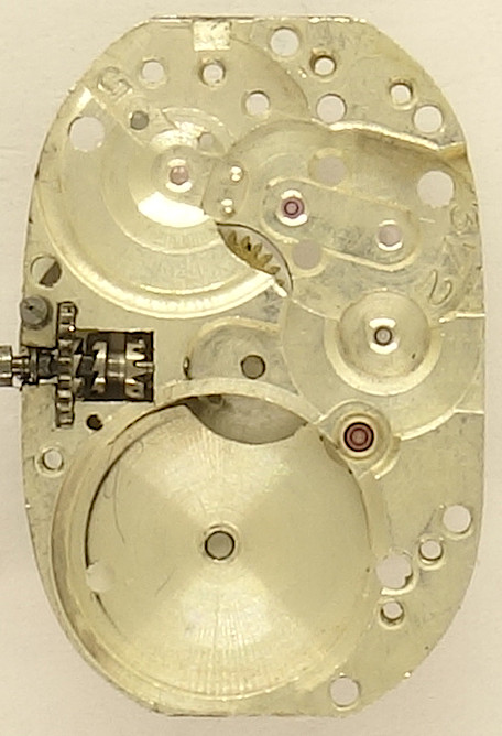 Der Aufbau des Räderwerks mit seinen filigranen Zahnrädern ist ganz klassisch, mit direkt angetriebenem zentralen Minutenrad, gefolgt von Kleinbodenrad, Sekundenrad und Stahl-Ankerrad. Alle Räder sind für die geringe Größe des Werks recht groß ausgeführt.