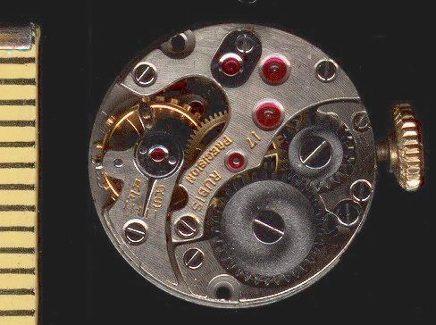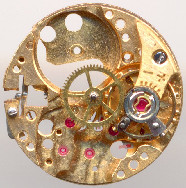 Das Ankerrad und das Lager des Sekundenrades überlappen sich ebenfalls, eine Bauweise, die man bei runden Werken vergleichsweise selten findet, bei Formwerken im Damenuhrenbereich dagegen sehr häufig.