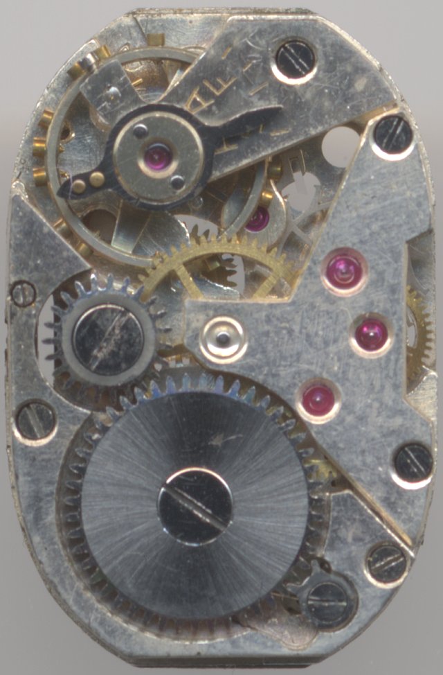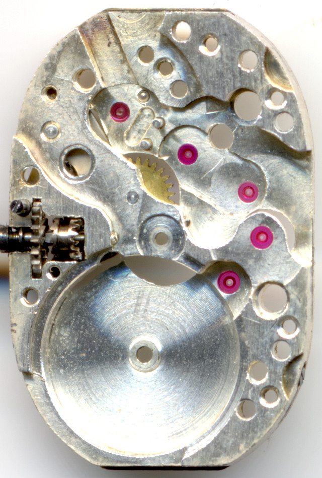Wie schon die Grundplatine erkennen läßt, sind alle kritischen Lager mit Steinen ausgestattet. Zusammen mit den restlichen Steinen im Werk kommt man so auf die seinerzeit optimale Zahl von 15 Steinen. Mehr wäre damals die absolute Ausnahme gewesen.