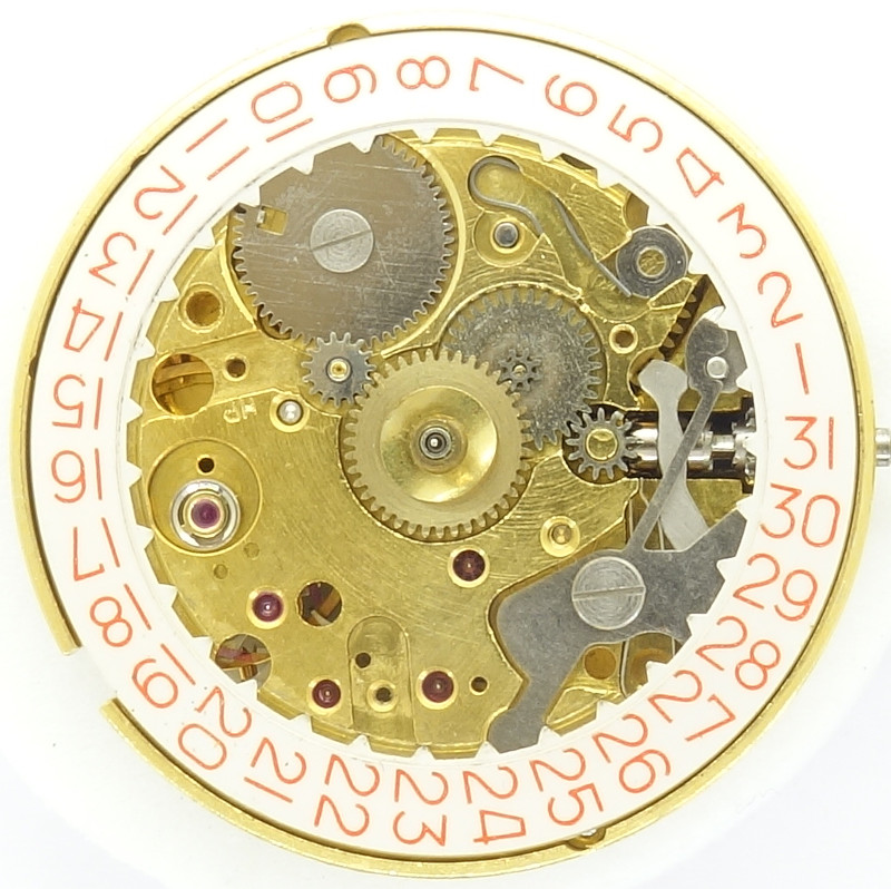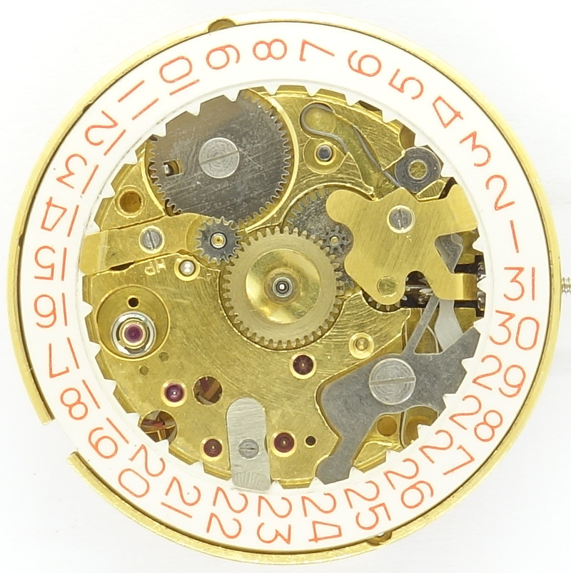 Dafür ist die Rastfunktion des Datumsrings besonders elegant gelöst: Ein flaches, unter einem Vorsprung gelagertes und mit einer Feder (ebenfalls unter einem Vorsprung gesichert gelagert) verbundenes Metallplättchen sorgt dafür, dass die Datumsscheibe stets sauber einrastet. Für den Uhrmacher ist es sehr angenehm, dass Felsa hier auf fliegend gelagerte Federn und Hebel (welche in aller Regel mit guten Flugeigenschaften glänzen) verzichtet hat.
