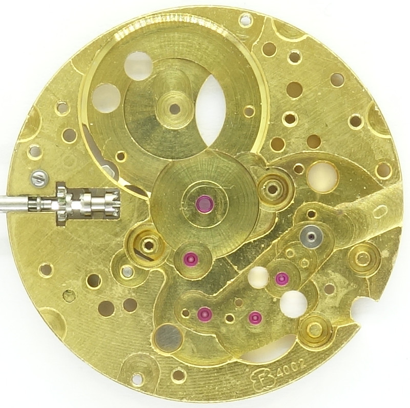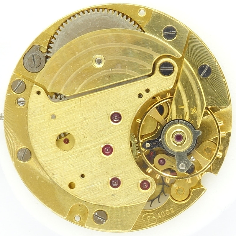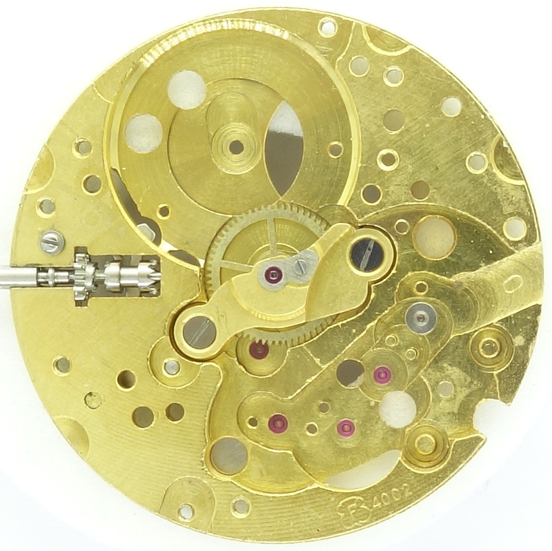 Ohne Automaticmodul entspricht das Felsa 4002 dem Kaliber Felsa 4012. Man kann gut erkennen, wie der Eingriff des Automaticmoduls in das Kronrad in Position 8:30 Uhr erfolgt.