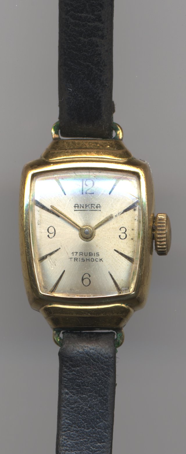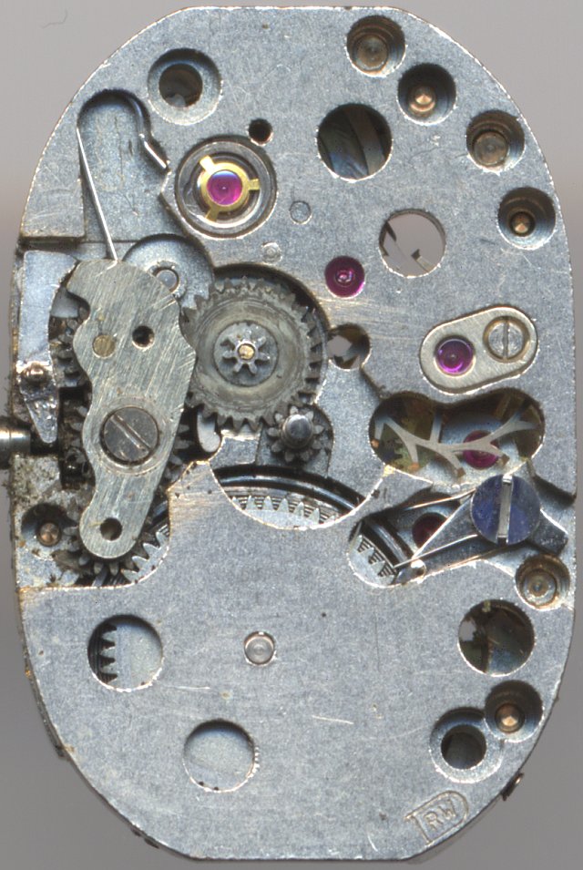 Dieses Formwerk besitzt zwar eine klassische Ankerhemmung mit Felsa-typischen durchsichtigen Ankerpaletten, aber der Rest des Werks, die eher einfachere Trishock-Stoßsicherung, der fehlende Rückerzeiger und der zifferblattseitige Wippenaufzug sind eher verwunderlich. Offenbar wurde Damenuhren damals nicht immer die bestmögliche Qualität zugestanden.