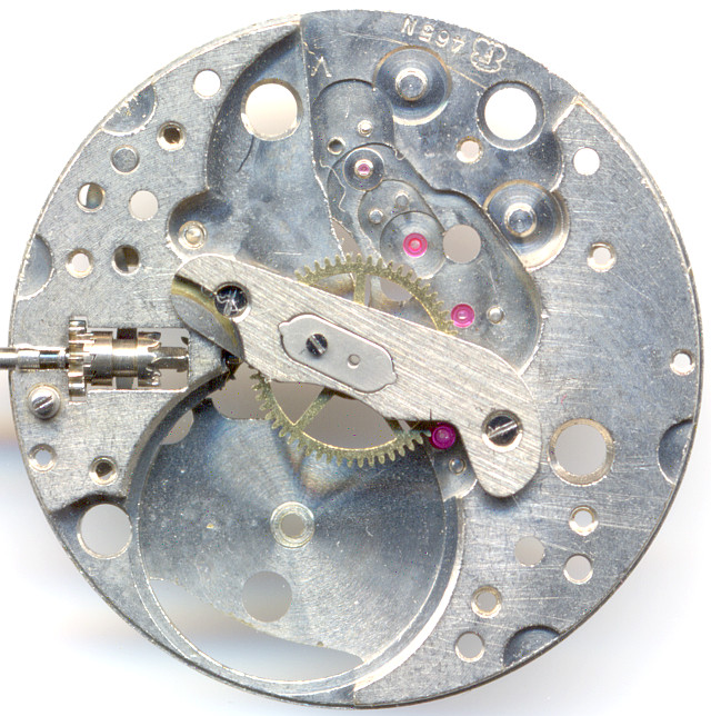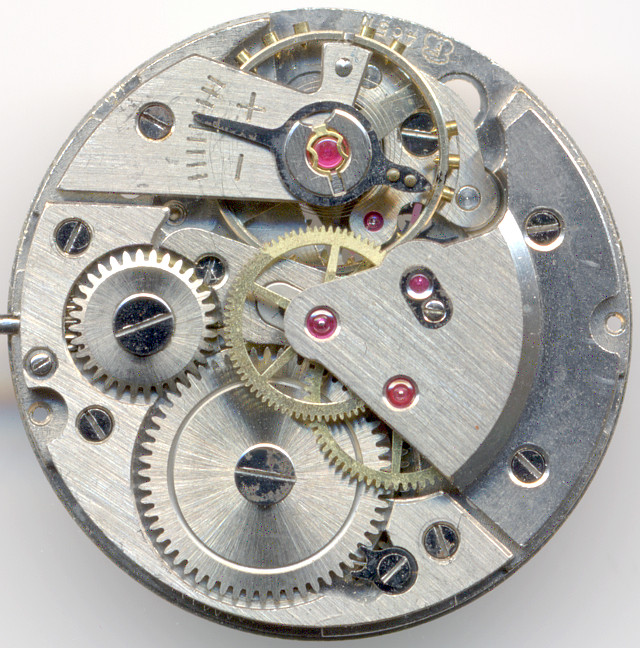 Wie es sich für Werke aus den 1950er Jahren gehört, besitzt das Werk ein zentrales Minutenrohr, das hier sogar unter einer Brücke, und nicht nur unter einem Klobel gelagert ist.