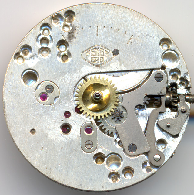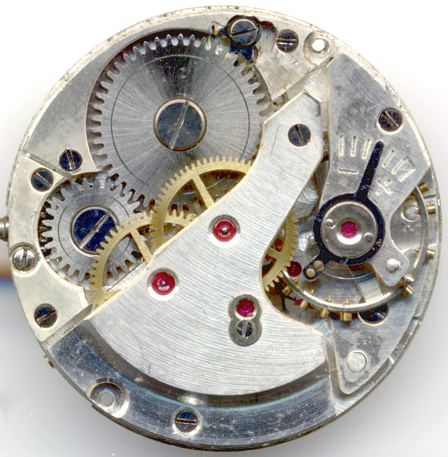 Video on YouTubeAnfang der 50er Jahre, als dieses Werk in Annemasse (Frankreich) auf den Markt kam, waren gerade Werke mit zweistöckigem Werkaufbau en vogue: Das vom Federhaus direkt angetreibene Minutenrad liegt unter der unteren Brücke, während darüber Kleinbodenrad, direkt im Kraftfluß befindliches Sekundenrad und das Ankerrad liegen: