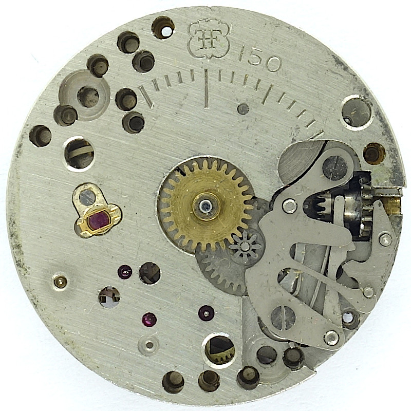 Die Markierung dieses Werks erfolgte jeweils auf der Zifferblattseite, anhand der Kalibernummer kann aber nicht auf die Ausführung der Räderwerksbrücke geschlossen werden, da in allen Fällen “FHF 150” eingestanzt ist.