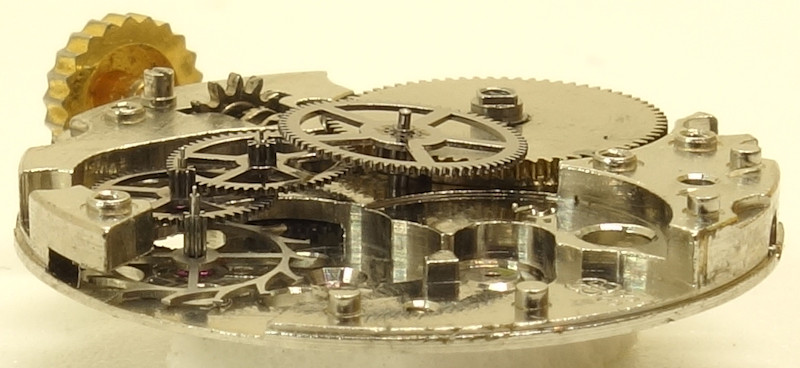 Auf der Zifferbattseite fällt als erstes der recht rohe Finish ins Auge. Solche verschliffenen Oberflächen kennt man eigentlich nur von fernöstlichen Billigstwerken, ein weiteres Indiz dafür, dass dieses Werk erst zu einer Zeit erschien, als der traditionelle Uhrenbau bereits stark unter (Kosten-)Druck stand.