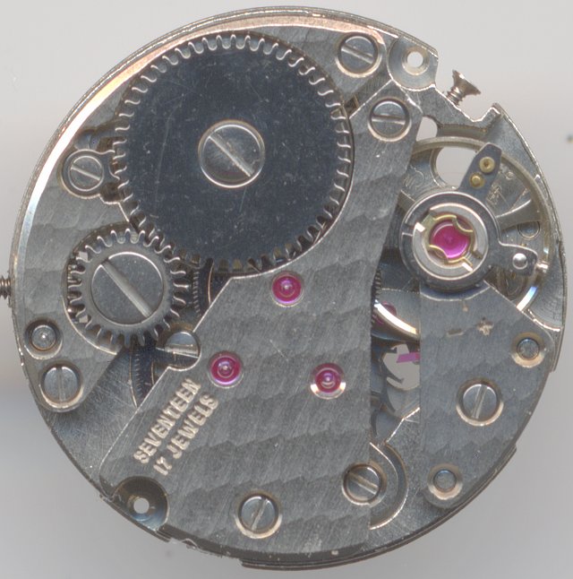 Aus den 70er Jahren stammt eines der “Spätwerke” der FHF, das Kaliber 37. Diesem Werk sieht man bereits an, daß der Rotstift regierte, sei es an dem “Hammerschlag”-Dekor (oder auch Nicht-Dekor) der Platinen oder an der sehr groß und roh ausgeführten Winkelhebelfeder, die gleichzeitig das Wechselrad in Position hält.