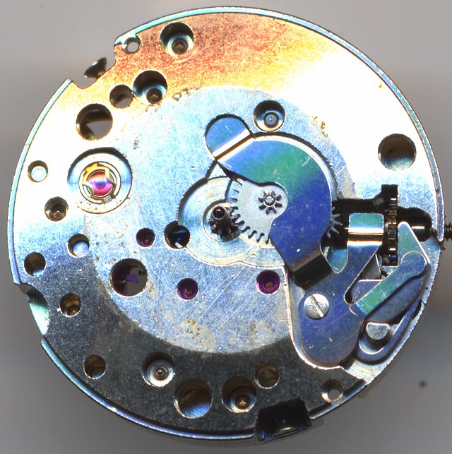 Zifferblattseitig wird ein Kupplungsaufzug eingesetzt, der aber bereits mit einer sehr großen, billigen Stanzfeder ausgestattet ist und zumindest optisch kaum einen schöneren Anblick bietet, als ein billigerer Wippenaufzug.