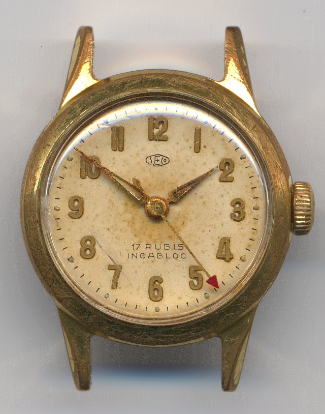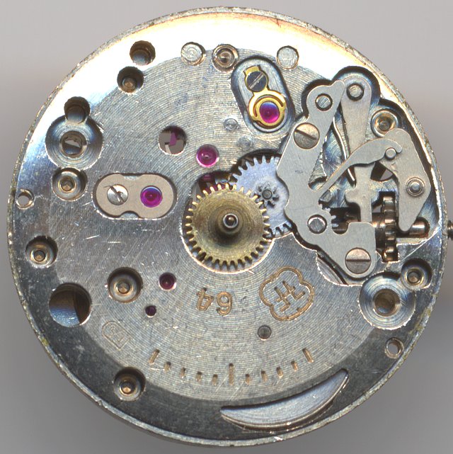 Das Damenuhrenwerk FHF 64 kam Anfang der 60er Jahre auf den Markt. Es besitzt einerseits noch den klassischen Werksaufbau mit direkt angetriebener Minute, andererseits bereits die damals aufkommende Zentralsekunde, die hier sogar direkt angetrieben ist. Aus diesem Grund mußte das Werk bei kleinem Durchmesser recht hoch gebaut werden - es ist quasi ein “Doppeldecker”, bei dem Sekunden- und Minutenrad übereinander gestapelt sind und das Ankerrad eine sehr lange Achse besitzt.