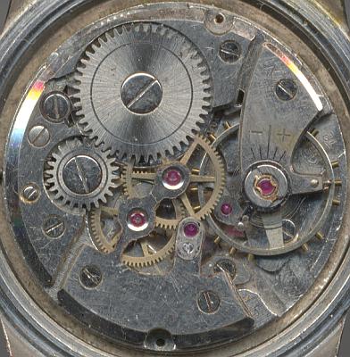 Die Zentralsekunde des sehr flach aufgebauten Werks ist direkt angetrieben; die Schrauben-Ringunruh besitzt eine gebläute Nivarox-1-Spirale, die noch fest mit dem Unruhkloben verbunden ist. Der fehlende Rückerzeiger hingegen gibt dem Werk bereits einen modernen Touch.
