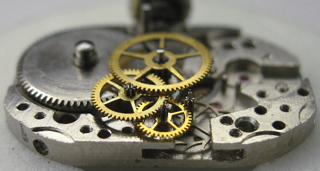 Das Räderwerk des Förster 630 ist ganz typisch, mit direkt angetriebener Minute und winzigem Sekundenrad. Bedingt durch die Form des Werks finden sowohl ein großes Federhaus, als auch eine relativ große Unruh Platz, beides ist vorteilhaft für die Ganggenauigkeit und längere Laufzeit.