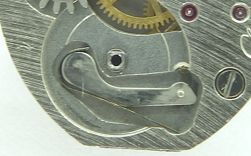 Alle Räder sind unter einer großen Dreiviertelplatine gelagert, unter dem Sperrrad befindet sich die Sperrklinke, eine platzsparende und betriebssichere Ausführung, die mit ganzen zwei Bauteilen auskommt, darunter eine gängige j-förmige Feder.