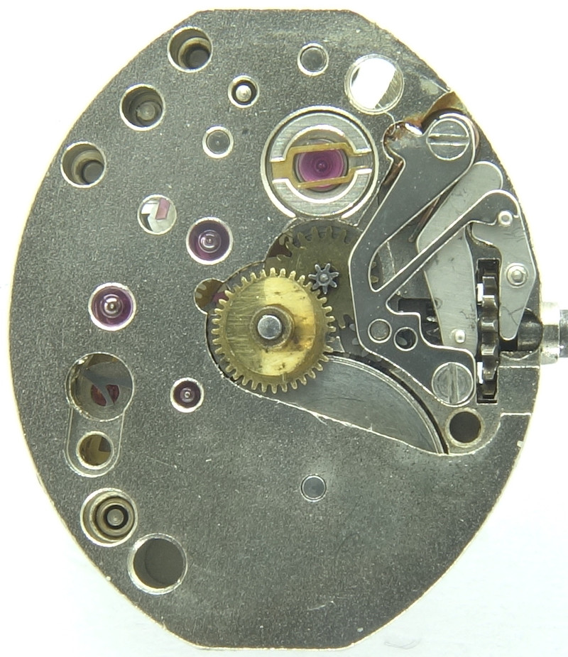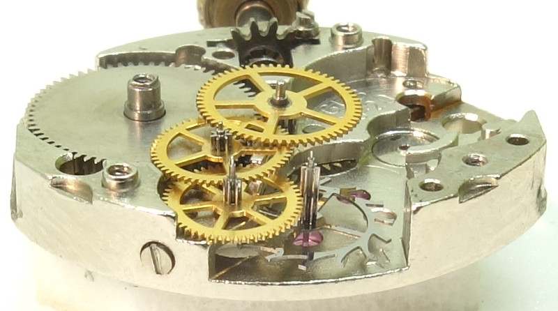 Das Räderwerk ist typisch für diese Art von Uhrwerken, es nutzt ein direkt angetriebenes zentrales Minutenrad (sogar beidseitig steingelagert!), gefolgt von den beiden kleinen Kleinboden- und Sekundenrädern und schließlich dem wieder eher großen und filigranen Ankerrad.