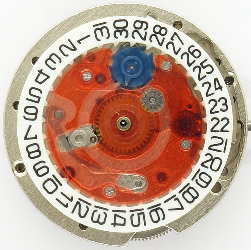 Leider wird der Datumsmechanismus mit einer stark konturierten Plastikscheibe abgedeckt. Da diese besonders dünn und dadurch auch labil ist, ist es vorprogrammiert, dass der Datumsmechanismus früher oder später seine Arbeit einstellt.