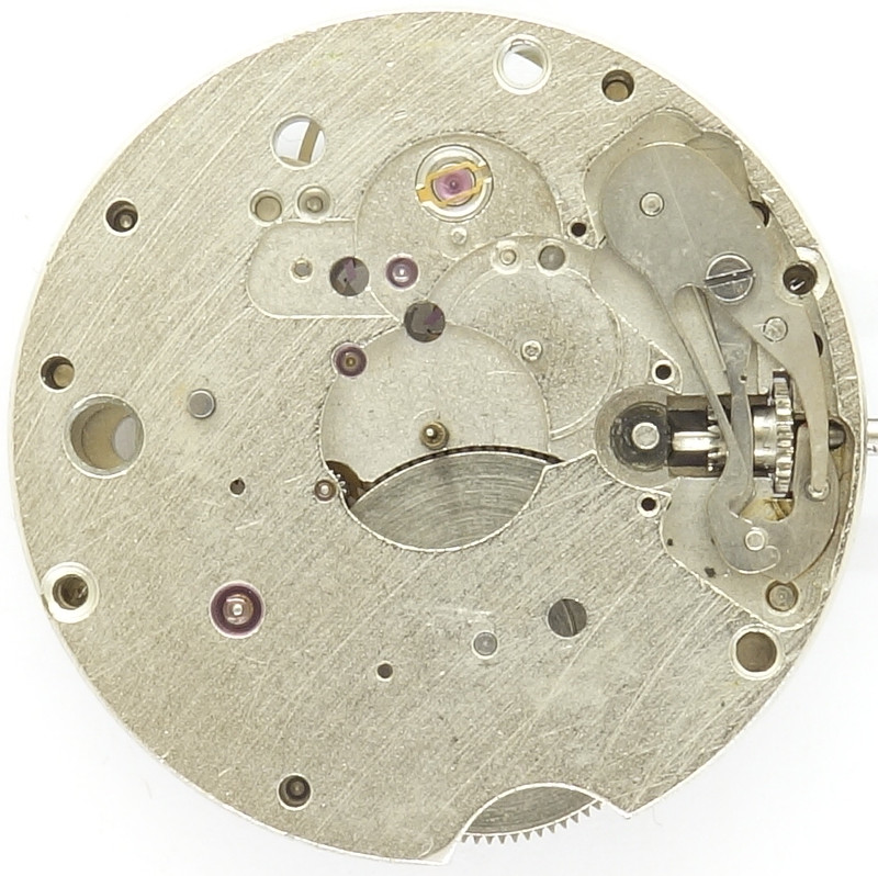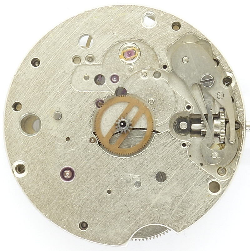 Die Grundplatine des 11 1/2 linigen Werks läßt bereits dessen modernen Aufbau erkennen: Die kleine Messingbuchse im Zentrum des Werks ist nur für die Lagerung der Zentralsekundenwelle gedacht, das Zeigerwerk, bzw. das Minutenrohr wird zifferblattseitig indirekt über das Kleinbodenradlager bei 3:30 Uhr, relativ nah am Zentrum angetrieben. Diese Konstruktion, die vor allem von ETA-Werken bekannt ist, erlaubt ein besonders großes Federhaus, was bei einem Schnellschwinger natürlich von Vorteil ist.